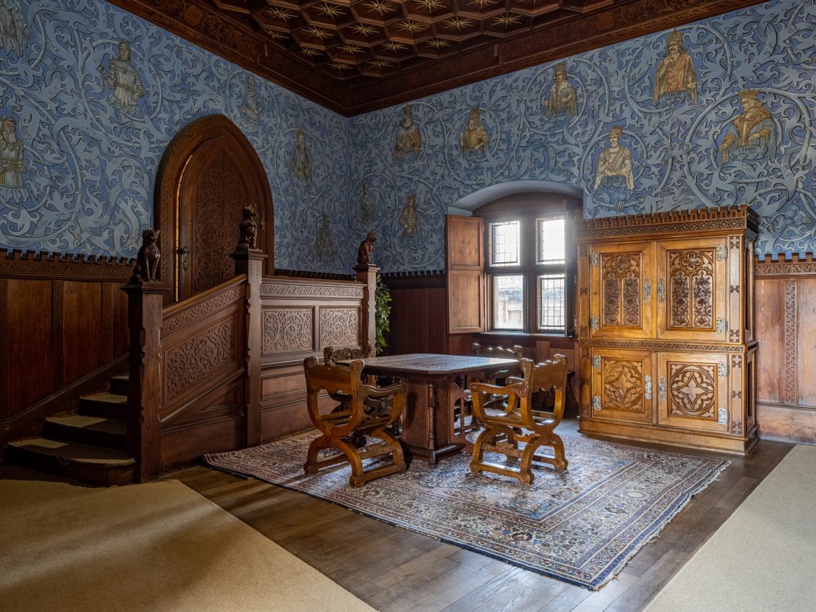 The Blue Room got its name from the colour of the blue painting of the walls. Among the floral ornaments there are half-figures of historical figures, mostly rulers. Here we find King Louis I. the Great, who gave town privileges to Bojnice in 1366, and his daughter Queen Mary I., who in turn elevated the nearby Prievidza to a rank of a royal town in 1383. Other owners of Bojnice Castle include King Matthias I. Corvinus, his illegitimate son John Corvinus and the later King John Zapolya. In the coffered ceiling there are gilded stars and three coats of arms of the owners of the castle: the Pálffy family (with a stag and a half-wheel), the Corvinus family (with a raven and a crescent moon) and the Zapolya family (a coat of arms divided into four fields with unicorns and silverwolves).