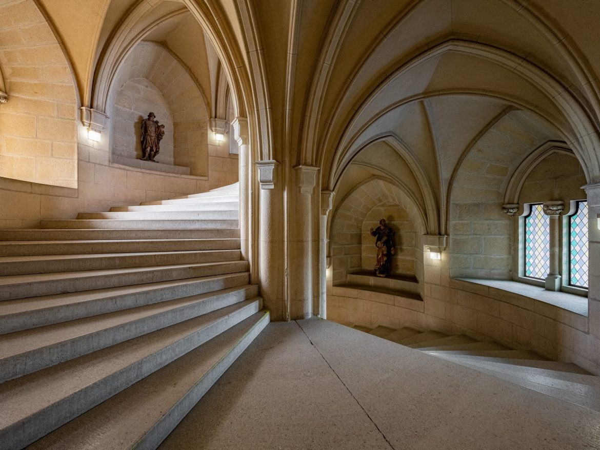 The Staircase Tower is the largest and the youngest tower of Bojnice castle. It was built from bottom to top between 1892 and 1893 on the site of the demolished part of the Baroque palace of the Middle Castle. Count Pálffy chose the octagonal staircase tower from Pierrefond castle as its model, but after starting its construction he masterfully sketched a different solution himself. He was probably inspired by the equestrian spiral staircase at Amboise castle.