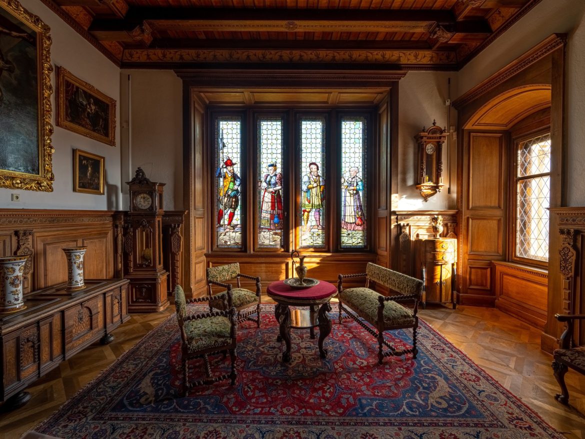 Obrazy na stenách pochádzajú zo 16. až 19. storočia a zobrazujú krajinomaľby, figurálne kompozície a náboženské motívy. Najväčší obraz nad kozubom „Na dušičky” namaľoval Herman Kaulbach v 2. polovici 19. storočia.