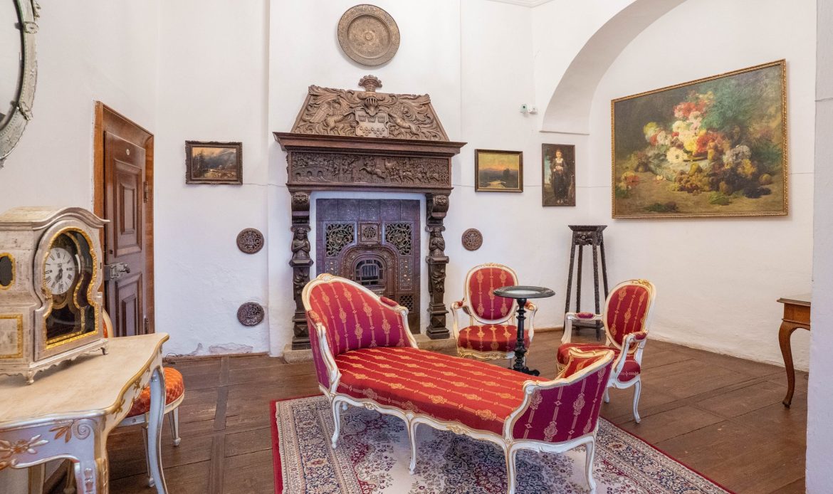 Obrazy na stenách pochádzajú zo 17. až 19. storočia, sú na nich zobrazené kvetinové zátišia a figurálne motívy. Najväčší obraz v miestnosti je zároveň i najstarším. Pochádza zo 17. storočia a má názov „Klaňanie troch kráľov”. Jeho autorom je Abrahám Jansens. Traja králi nesú dary malému Ježiškovi: zlato – symbol kráľa, kadidlo – symbol božstva, myrhu – symbol mučeníckej smrti. Postavy kráľov zároveň symbolizujú dovtedy tri známe svetadiely: Európu, Áziu a Afriku.