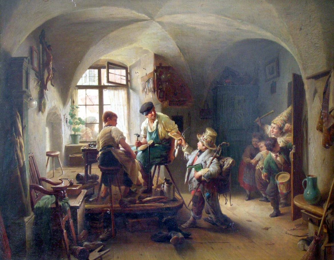 Obuvnícka dielňa, Peter Baumgartner, olej, drevo, 2. polovica 19. storočia